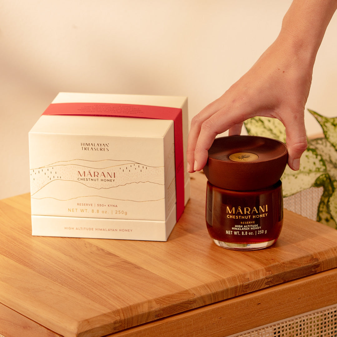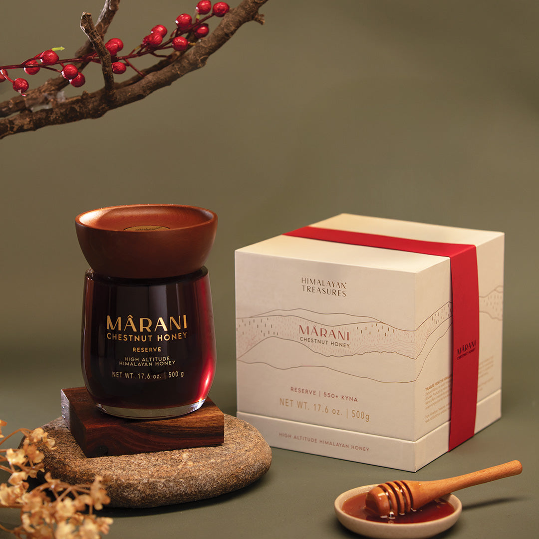 For those who seek the rarest and purest expression of Himalayan honey, Mârani Reserve offers an intimate encounter with nature’s finest. Drawn from the smallest, most limited micro-batches, each jar carries an intense, layered, and profoundly resonant character, rich in potent natural compoundslikeKYNA (>550 µg/g). Our Reserve variant represents a select harvest from the high Himalayas, limited in supply, meticulously chosen, and embodying the most refined expression of Mârani.